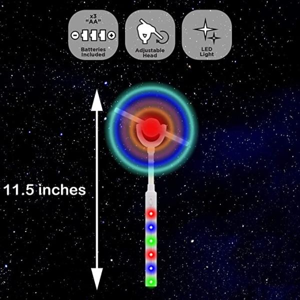 1. The enchanting fun of light, our glowing wand is amazing. This spinning glowing toy stick has a row of colorful super bright lights on top. When activated, they transform into a brilliant multi-colored disc that cycles through various light patterns. It is durable and the head can be tilted. Perfect for summer parties, 4th of July party supplies, beach parties, parades, concerts, raves and more. Includes replaceable battery.